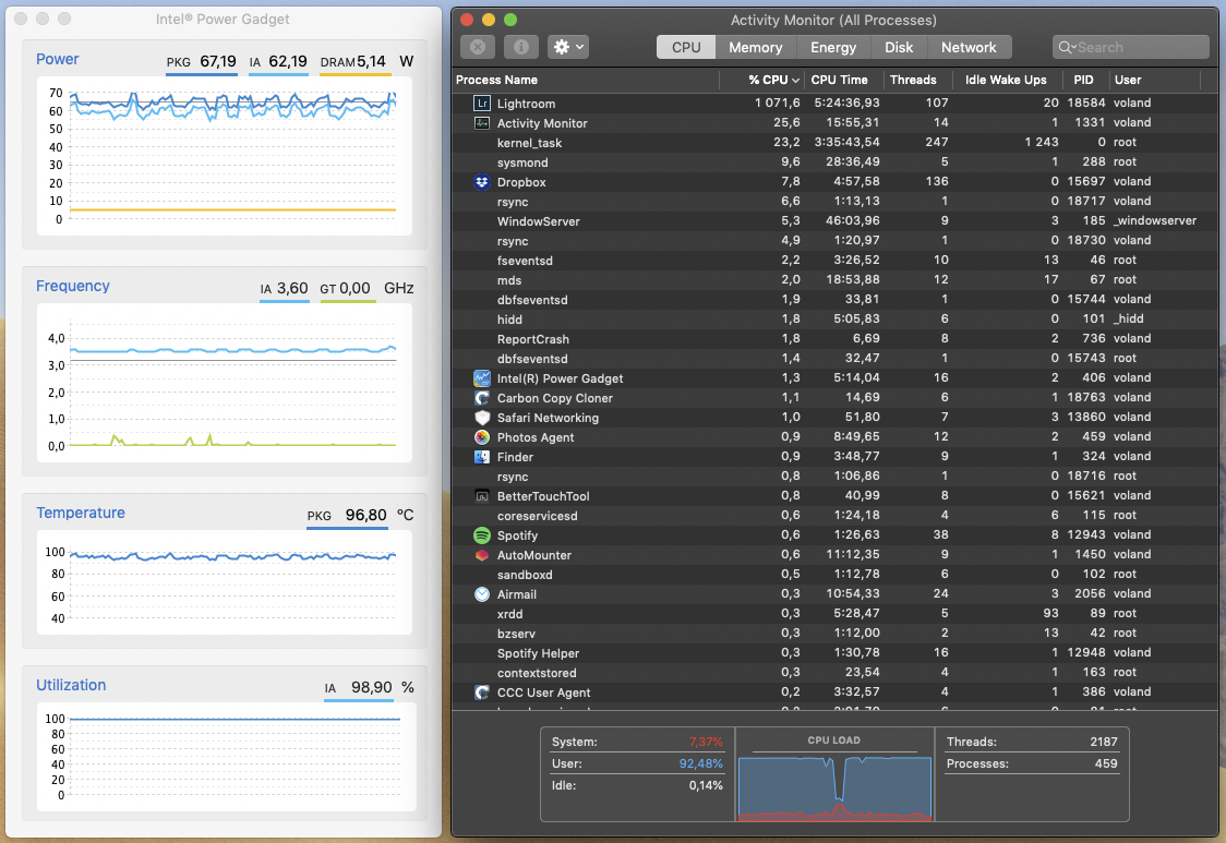 i7 mocno daje radę. Gdy nic się nie robi, to system obniża mu taktowanie, ale jak tylko trzeba cokolwiek przeliczyć, to od razu GHz skaczą aż do 4,6 Ghz. Lightroom podczas generowania miniatur 1:1 nie był mi w stanie rozgrzać komputera tak, żeby taktowanie musiało spaść do natywnych 3,2 GHz. Zamiast tego utrzymywało się na poziomie 3,5 – 3,6 GHz (nawet po kilku godzinach ciągłego obciążenia). Takie prace Miniacz wykonuje przy temperaturze procesora blisko 100 stopni Celsjusza, która temu modelowi nie przeszkadza . Dodam że wspomniane taktowania uzyskiwałem przy wyłączonej klimatyzacji, więc w pomieszczeniu było minimum 30 stopni.