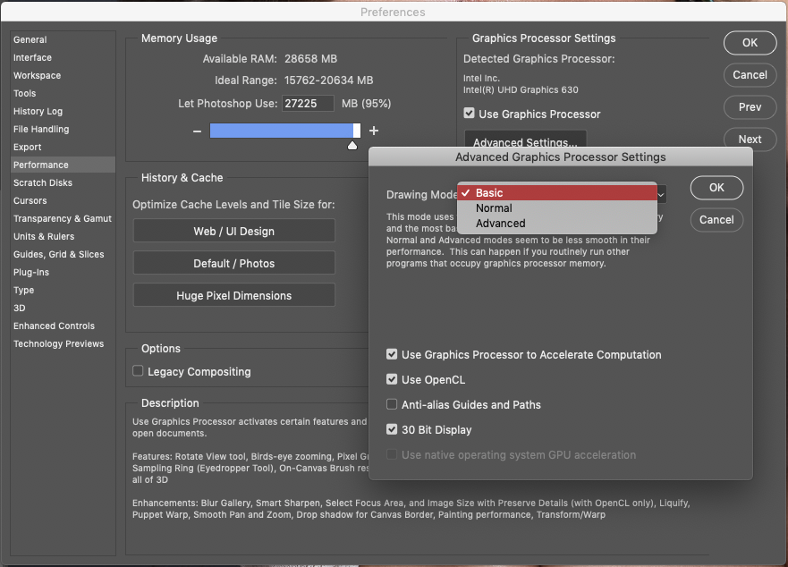 Wtedy responsywność jest dobra i można pracować komfortowo na dużych plikach. Na pozostałych opcjach rysowania miałem gorzej (sprawdzałem na pliku PSD 36 Mpix z wieloma warstwami). Jednak to nic pewnego, trzeba by potestować dłużej, na różnych zdjęciach. Poza tym takie duże pliki PSD zaraz po uruchomieniu trochę klatkują np. przy zoomowaniu, ale po chwili wszystko jest zbuforowane i śmiga płynnie. Na porządnej dedykowanej karcie oczywiście opcja zaawansowana będzie lepsza.